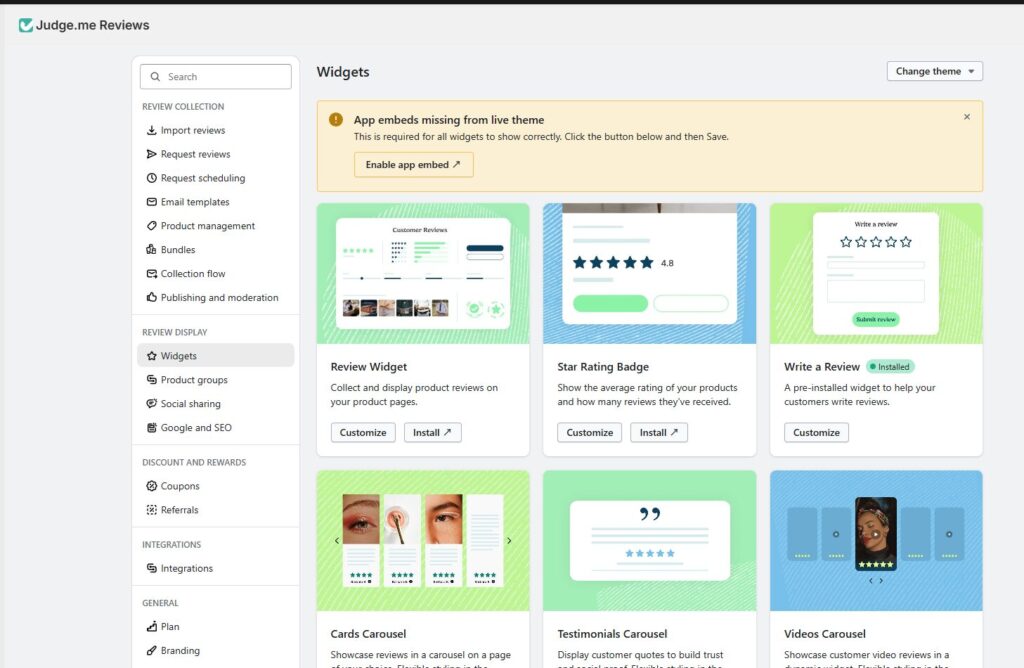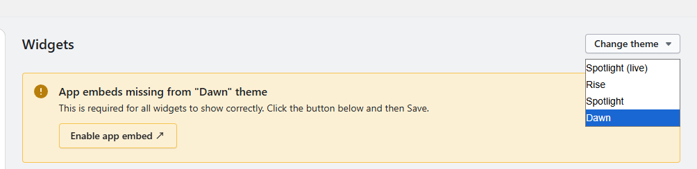 • Judge.me Widgets画面の警告表示